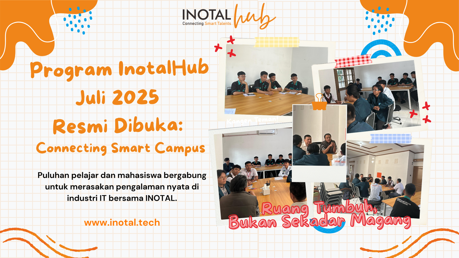 Bandung, 1 Juli 2025 – Program internship InotalHub kembali hadir dan resmi dibuka pada awal Juli 2025. Program yang mengusung tagline Connecting Smart Campus ini menjadi wadah bagi pelajar dan mahasiswa untuk merasakan langsung atmosfer industri IT, sekaligus mengasah keterampilan mereka melalui pengalaman kerja nyata.
